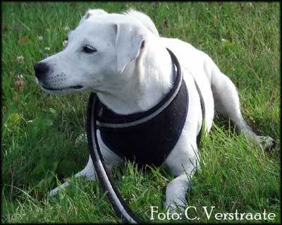 Sen var det då Vipers tur... vi gick ut för att sätta på munkorgen.. de visade hur den ska sitta o hur hårt... Denna gillade han inte o försökte ta av den...Eftersom detta var hans första gång skulle det bara bli halva banan ungefär... Och han skulle inte starta bakom trasan utan den skulle dras förbi honom...