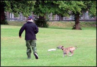 Först när han fick syn på trasan så va den lite stor o läskig så matte fick springa med *pust*... ojjj matte springer... va kuuul, då måste jag springa efter henne... Sen fick han syn på trasan o rusade efter... Han blev väääääldigt snopen när trasan gjorde första 90-graders svängen o försvann framför nosen på honom..... ??!!?? Höhh, vart tog den vägen??? När han fick syn på den igen var det inga problem alls.... han jagade fokuserat o klarade resterande svängar... JÄTTEDUTTI KILLE!!! Jubel!!! Jag försökte få honom bli lite intresserad av trasan men när den va still så va den så stoooor o läskig... o prasslade så otäckt så nä... Vippe va inte intresserad... han förstökte genast att ta av munkorgen istället...