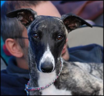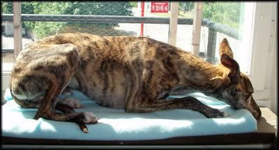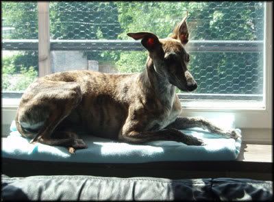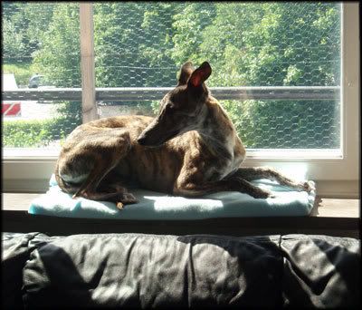 Sol-whippet! Viper tycker att eftersom katterna får ligga i fönstret o sola så får han åxå d!!!