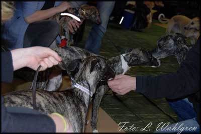 Idag tog vi en åktur till utställningen där Viper skulle ha gjort sin debut i ringen. Mest för miljöträning o för att få se kull-syrrorna Sky o Nessa + storasyster Chili. Som ren bonus va pappa Mille där åxå – så vi kunde jämföra allihop. Jättekul o se hur de andra har utvecklats. Viper är nog tyvärr minst i kullen. *ÄT hundskrälle* [Haha, nej jag vet inte va d beror på men visst skulle jag gärna se en ökad matlust hos grabben!]