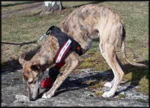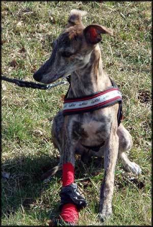 Han verkar inte besväras så mkt av tassen alls.. mest irriterad e han på plastpåsen vi satt över bandaget - den prasslar så spännande att man emellanåt måste stanna o försöka ta bort den...