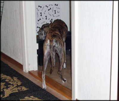 Sen hade husse förevigat Vipers matstil åxå... Det e tydligen LIVSVIKTIGT att alltid ha MINST en, helst två, baktassarna kvar ute i hallen medan man äter...